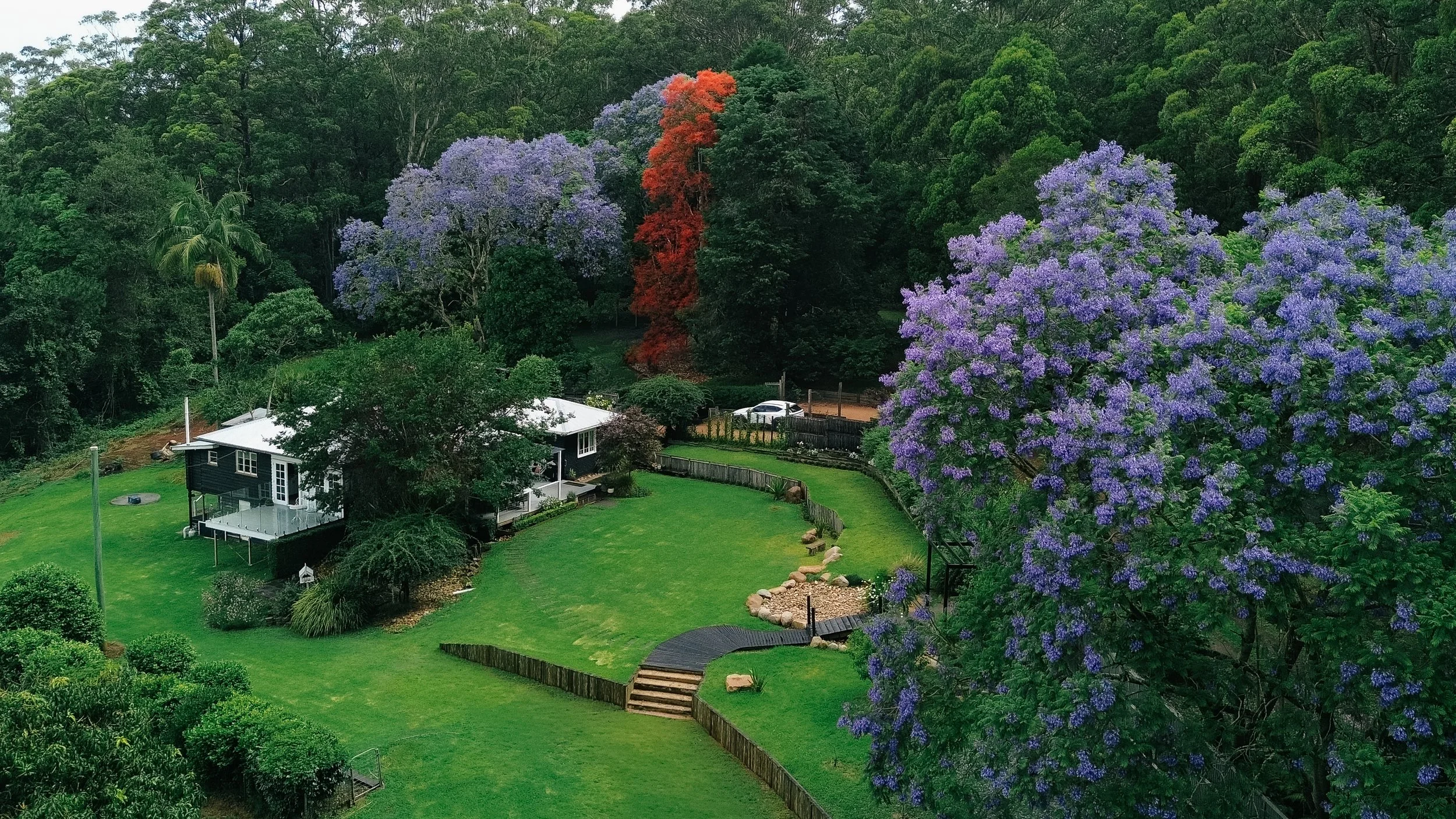 Nestled in the serenity of 40-acres of subtropical rainforest on the outskirts of Ravensbourne, the property sleeps 10 people across the thoughtfully renovated House and Studio.